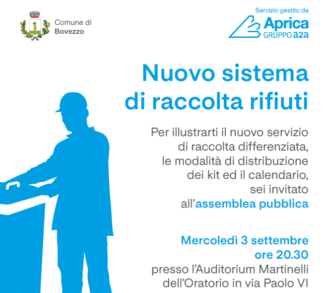 La cittadinaza è invitata a partecipare all'Assemblea Pubblica per l'illustrazione del nuovo servizio di raccolta, delle modalità di distribuzione dei kit e del calendario, che si terrà il giorno 3 settembre ore 20.30 presso l'Auditorium Martinelli dell'Oratorio in via Paolo VI